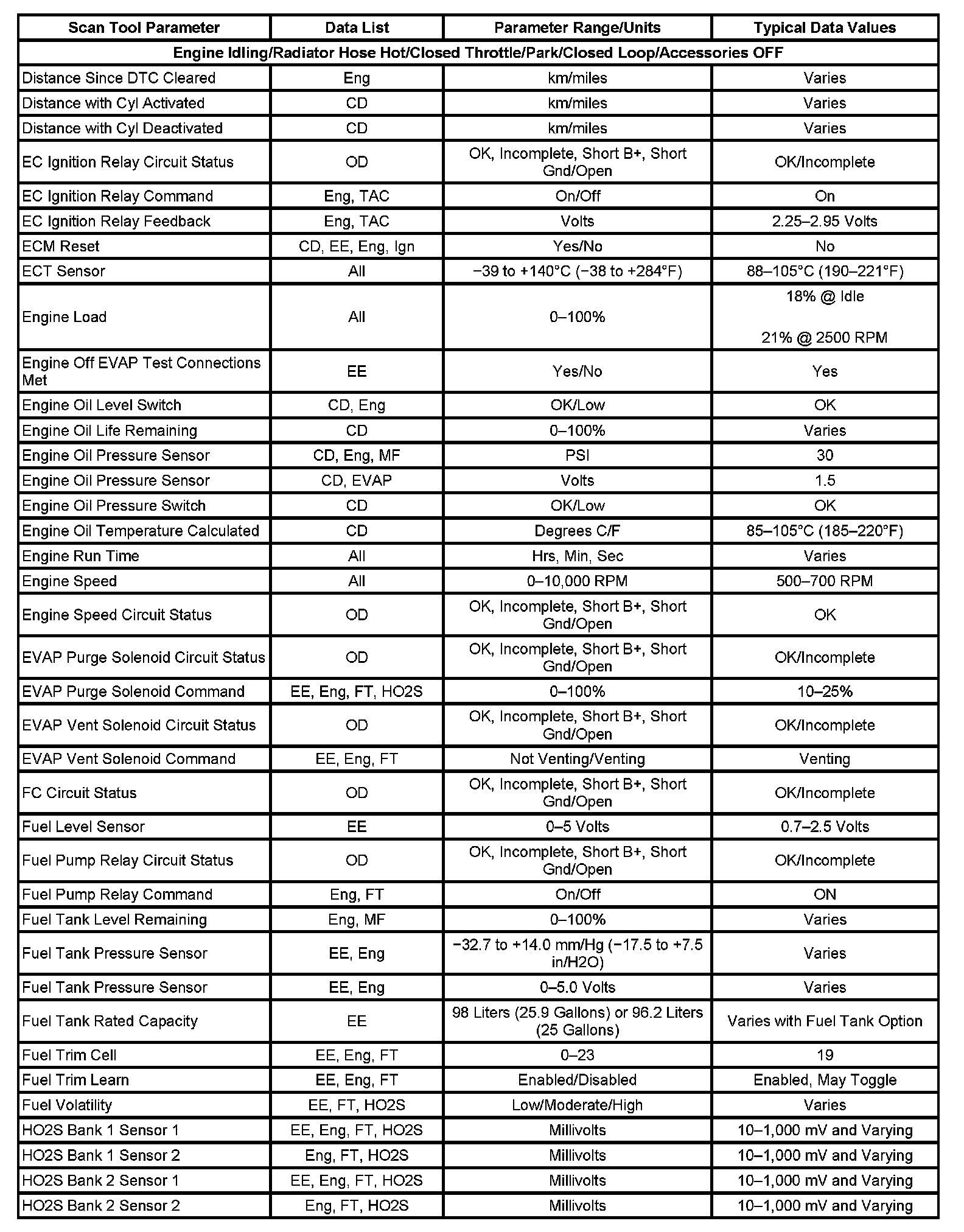 The Engine Scan Tool Data List contains all engine related parameters that are available on the scan tool. The list is arranged in alphabetical order. A given parameter may appear in any one of the data lists, and in some cases may appear more than once, or in more than one data list in order to group certain related parameters together.