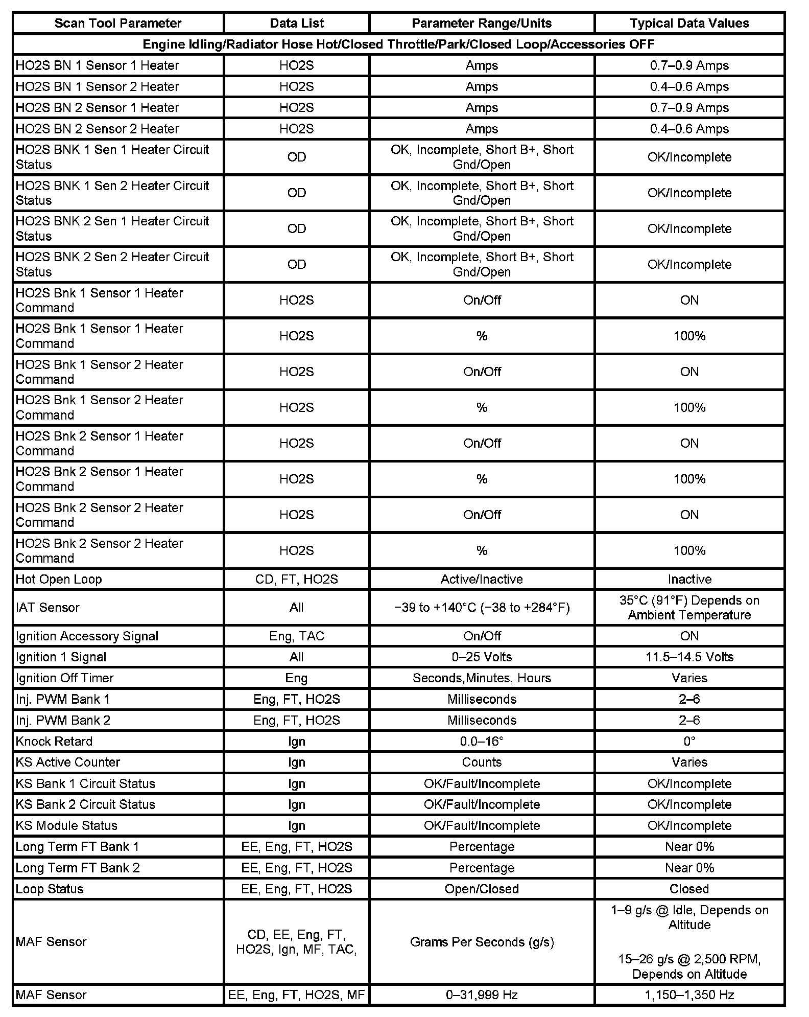 Scan tool values from a properly running engine may be used for comparison with the engine you are diagnosing. The Engine Scan Tool Data List represents values that would be seen on a normal running engine at idle.