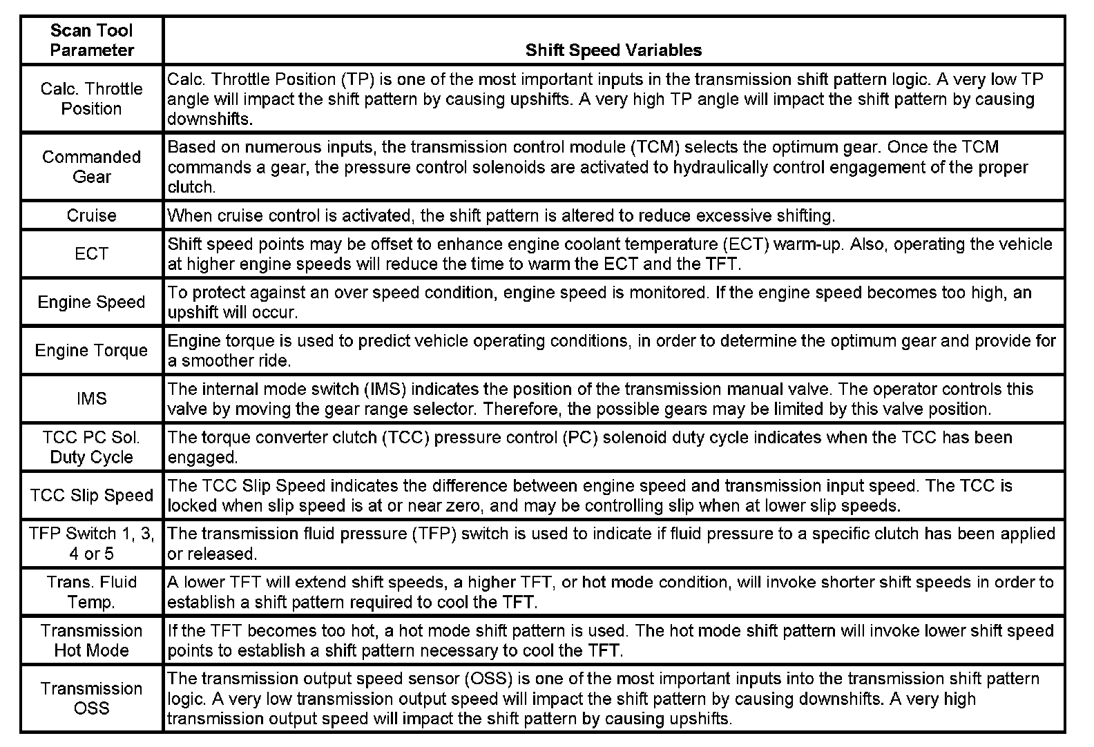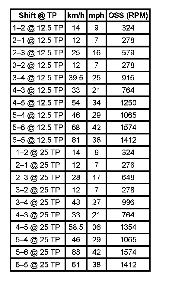 Important: Shift speed points are affected by many different vehicle and transmission operating conditions. The table above represents shift speed points calibrated at specific throttle angles during normal operating conditions and a temperature range between 0 -130° C (32-266° F). These shift speed points are also based on an axle ratio of 3.42, and assume a production-intent tire size. The table below illustrates a number of different variables that influence these shift speed points. Based on a given operating condition, these variables may override the normal shift speed points. To assist in monitoring the different variables, the respective scan tool data parameter is also listed.