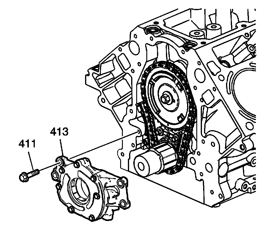 Oil pump (413) onto the crankshaft sprocket until the pump housing contacts the face of the engine block.