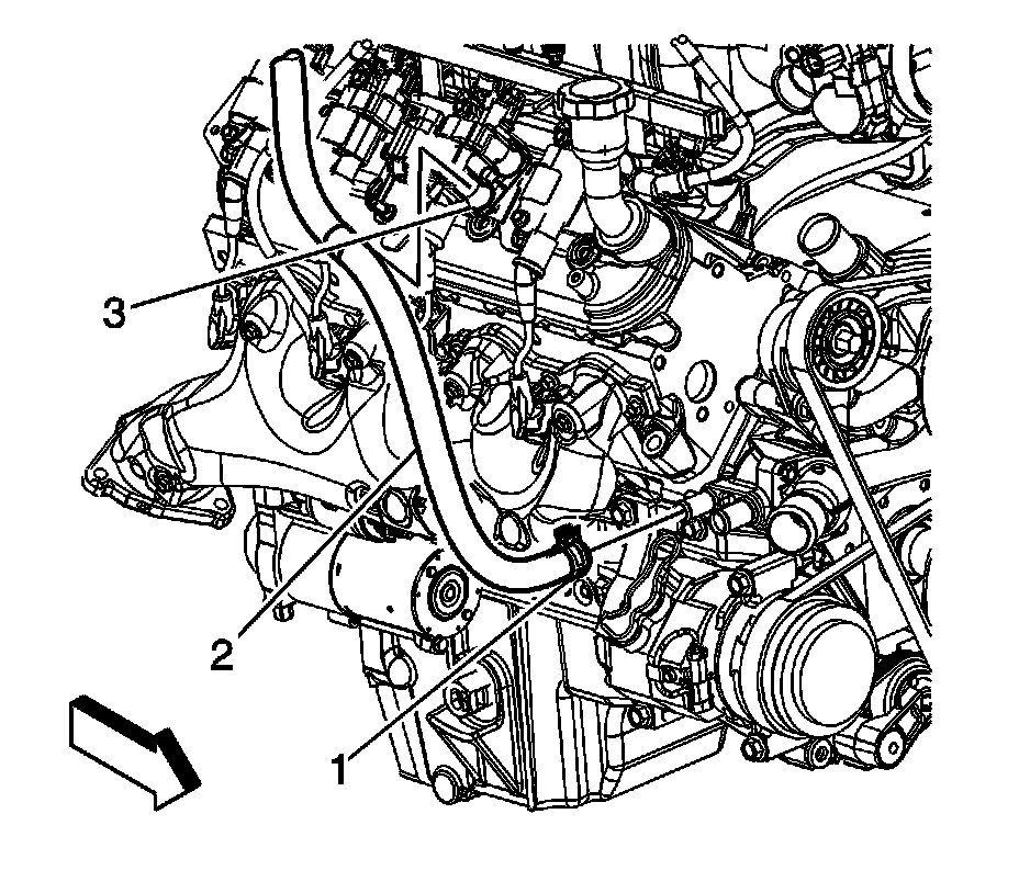 12. Position the radiator inlet hose clamp (3) at the water pump.