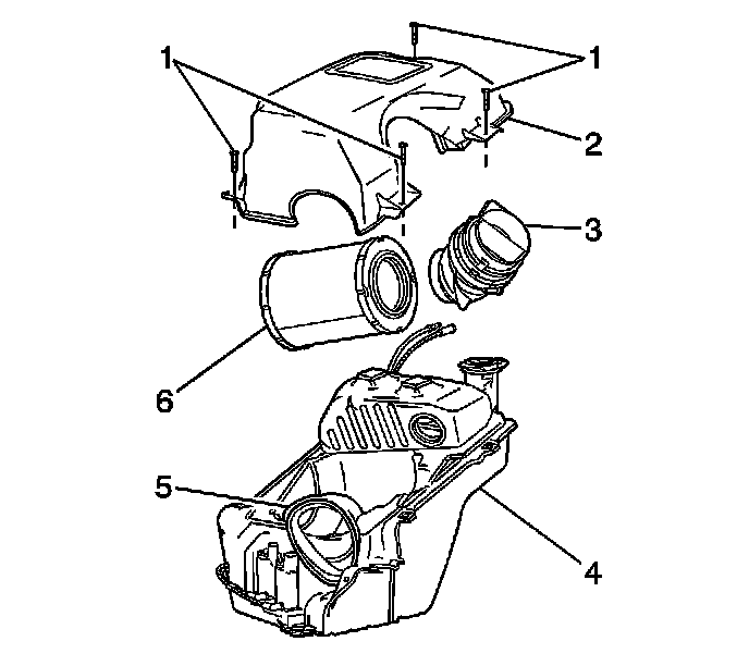 1. Remove the following components from the lower air cleaner housing/washer solvent tank assembly (4).