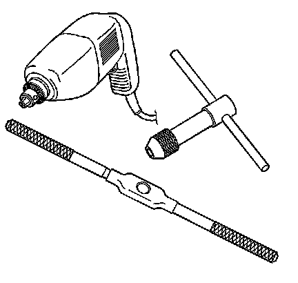 The tool kit J 42385-400 is designed for use with either a suitable tap wrench or drill motor. Limited access and larger hole repair may process better using a tap wrench. An extension J 43965 may also be necessary to drive the thread repair tooling dependent on access to the hole being repaired.