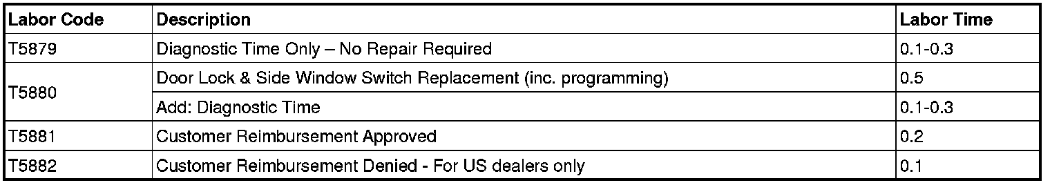 - If the driver side door lock and side window switch does NOT need to be replaced, determine cause of vehicle condition. Additional diagnostic time and repairs are NOT covered under this field action bulletin. Assign payment through warranty, goodwill or customer pay.