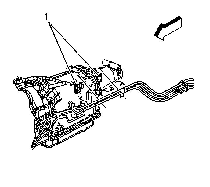 6. Remove the EVAP/fuel hose/pipe assembly from the retaining clips (1) on the transmission.