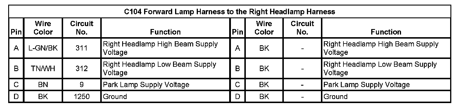 C104 Forward Lamp Harness to the Right Headlamp Harness