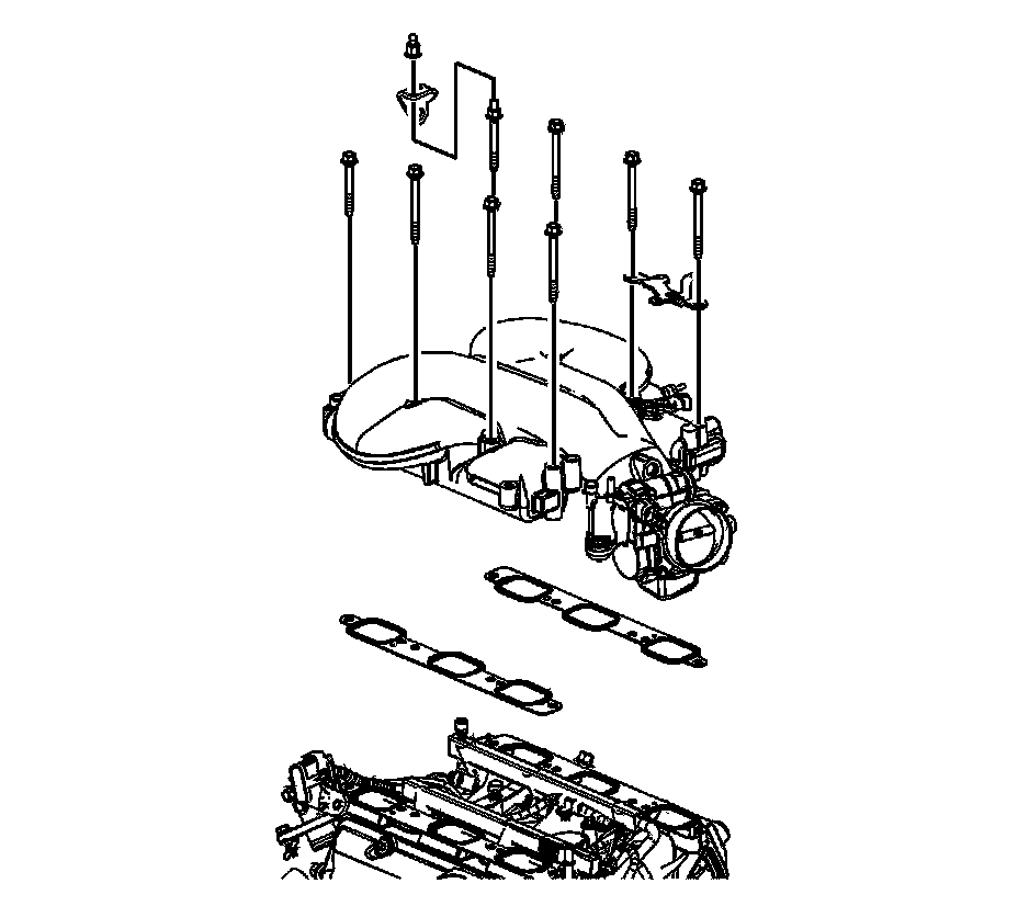 2. Apply threadlock GM P/N 12345382 (Canadian P/N 10953489) or equivalent to the upper intake manifold bolt threads.