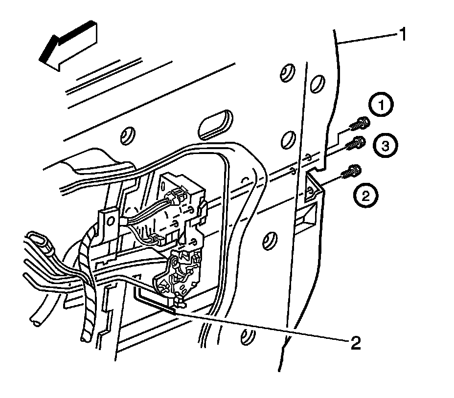 4. Install the 3 (1) door to latch (2) screws.
