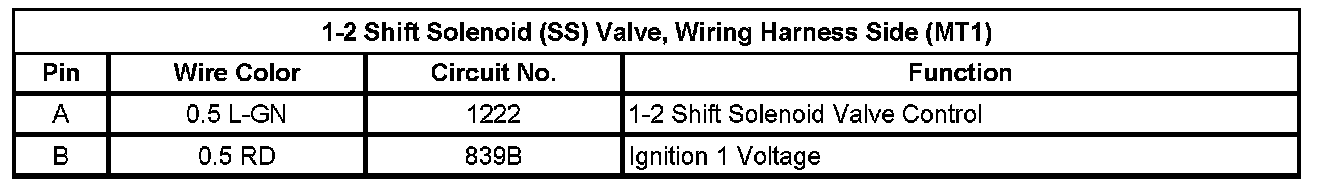 1-2 Shift Solenoid (SS) Valve, Wiring Harness Side (MT1)