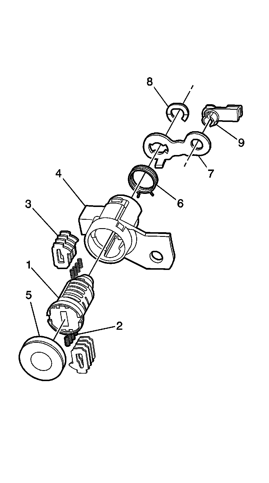 Important: The front side door lock cylinder tumblers (3) are not self-retaining and must be held in place if the key is not fully inserted into the lock cylinder or until the rotor (1) is assembled into the rotor case (4).