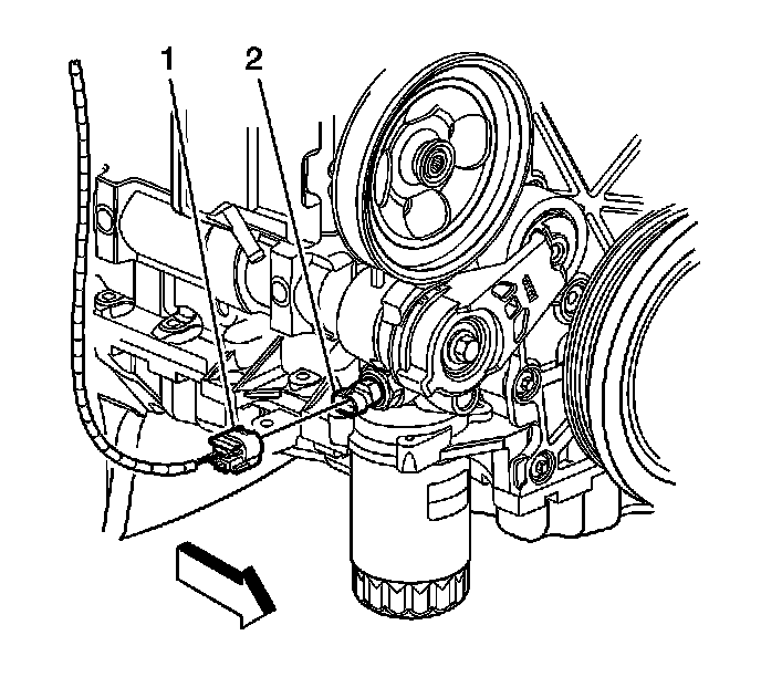 2. Disconnect the engine wiring harness electrical connector (1) from the oil pressure switch (2).