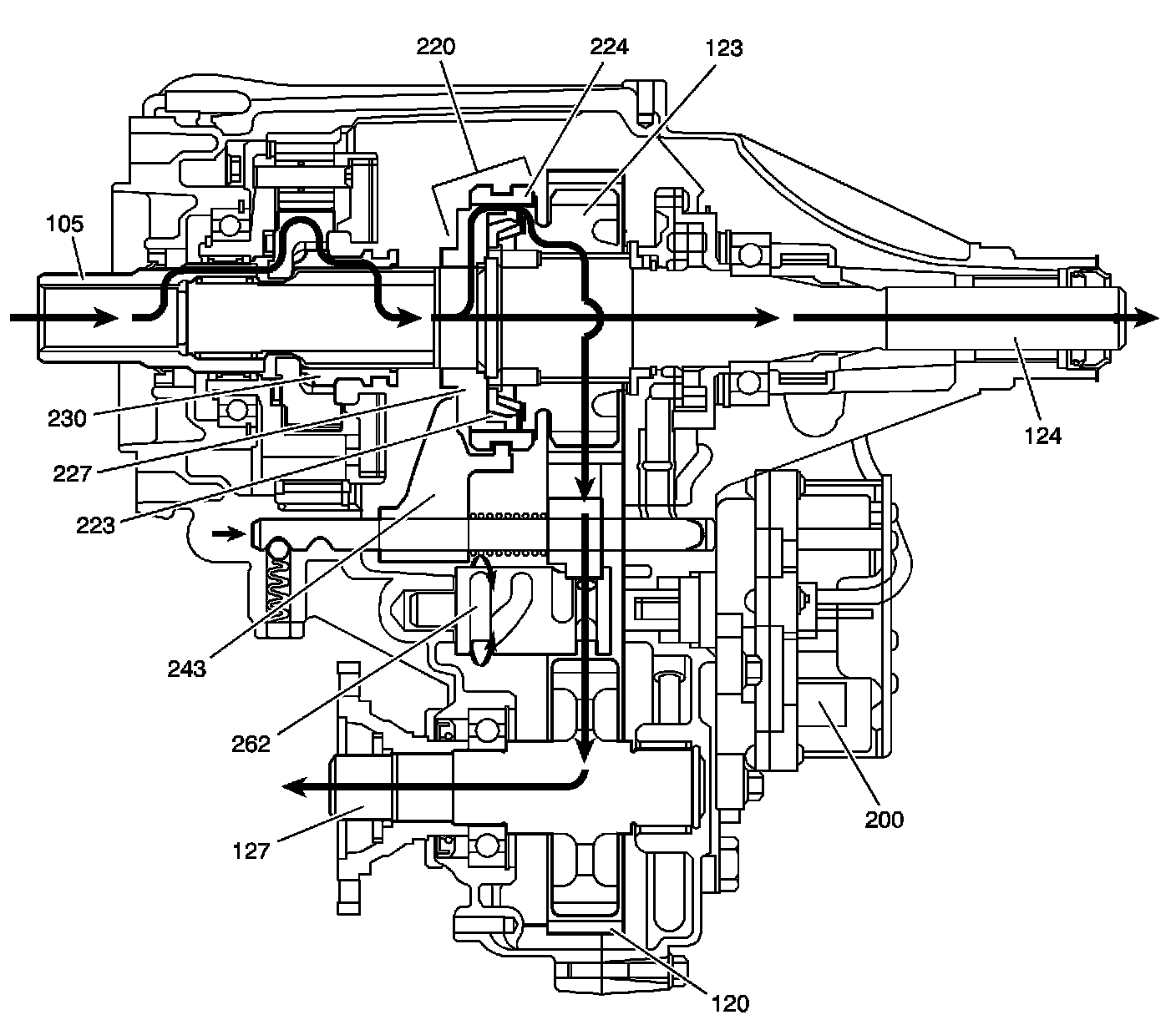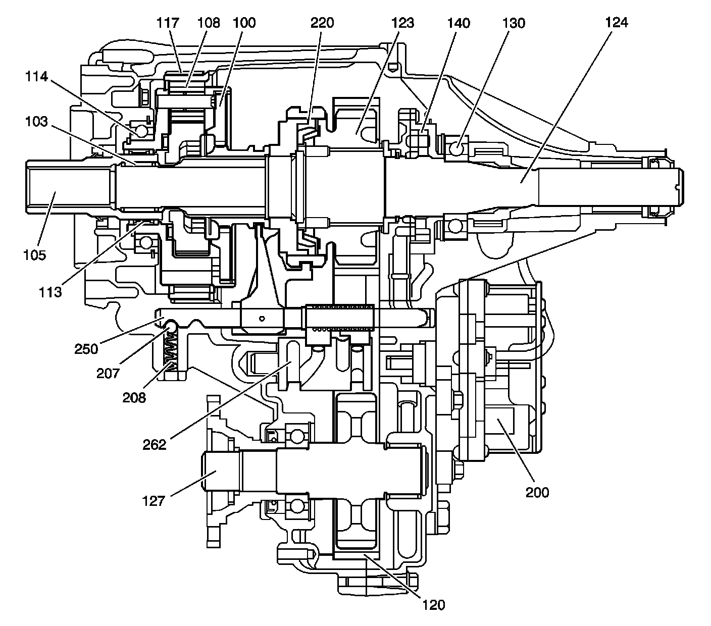 The outer teeth, or low range teeth, on the input shaft (105), which now acts like a sun gear, delivers the engine power to the pinion gears (108) in the planetary carrier (112). Rotating the pinion gears (108), which are engaged in the annulus gear (117), rotates the planetary carrier (112). The planetary carrier (112) delivers the power to the high/low range sleeve (230). The high/low range sleeve (230) then drives the rear output shaft (124), providing a 2.48:1 reduction to the speed of the rear output shaft (124). The 2/4 wheel drive synchronizer is still engaged, and engine torque is delivered to front and rear propeller shafts.