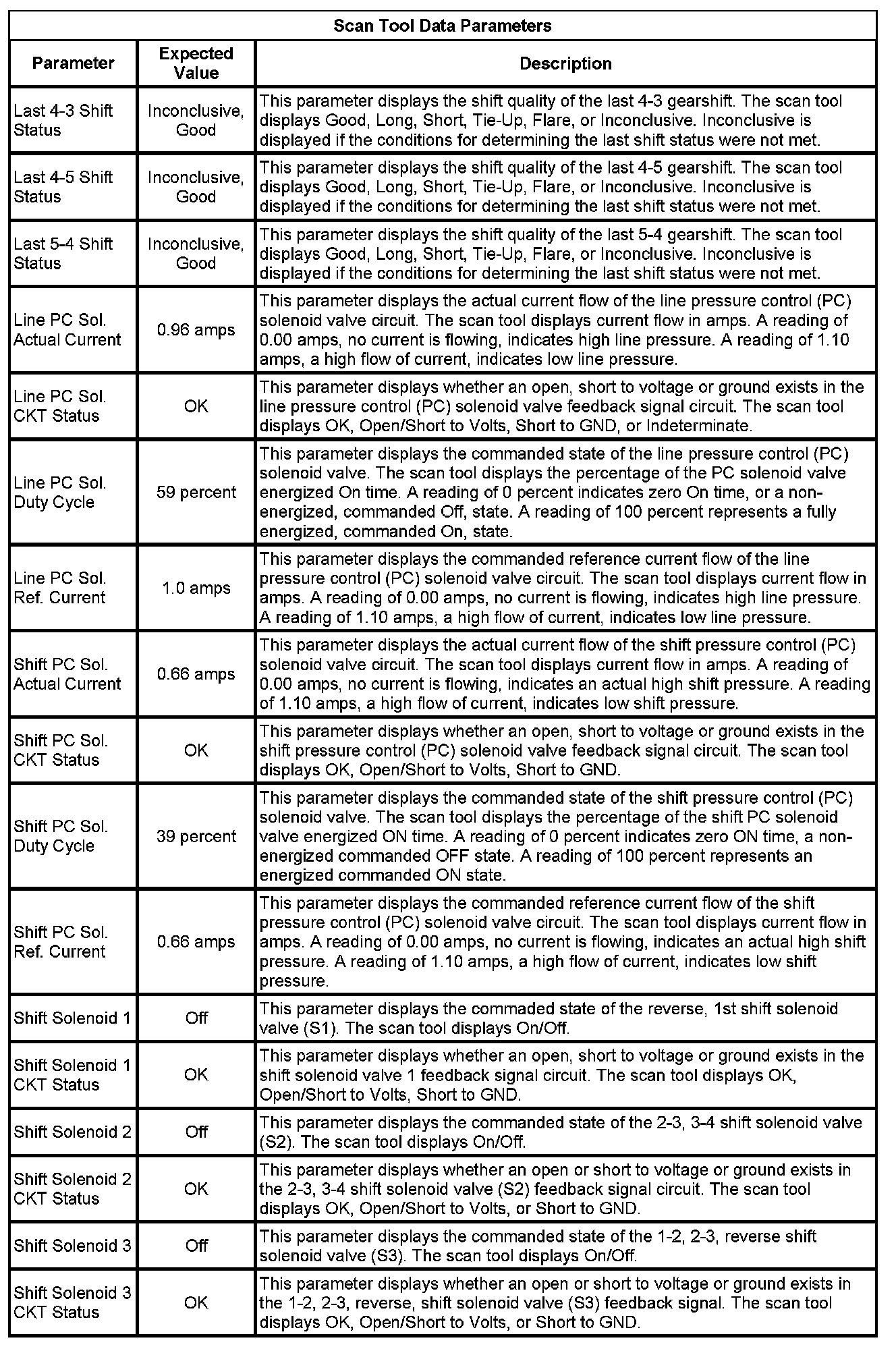 The scan tool values from a properly functioning transmission may be used for comparison with the transmission you are diagnosing. The values below represent a typical display recorded from a properly functioning system.