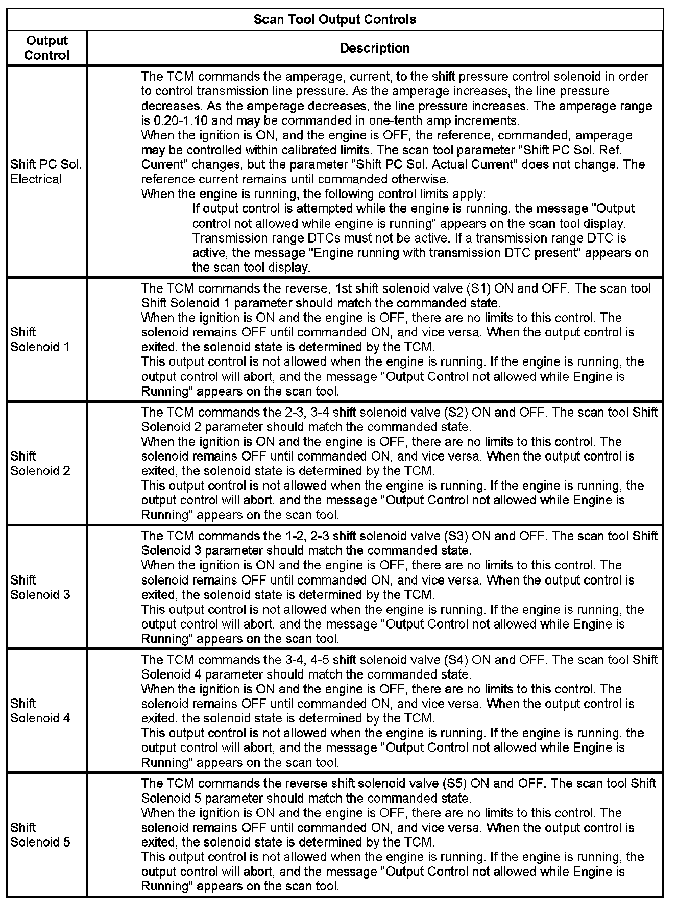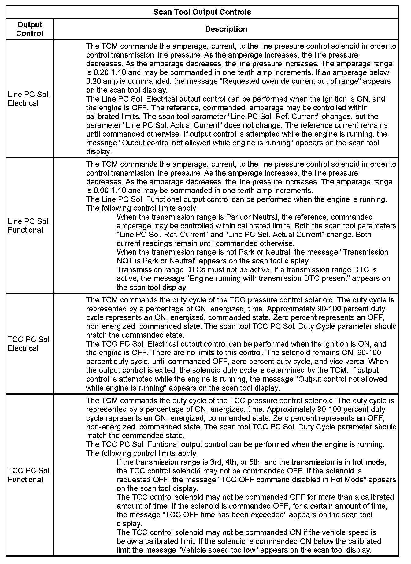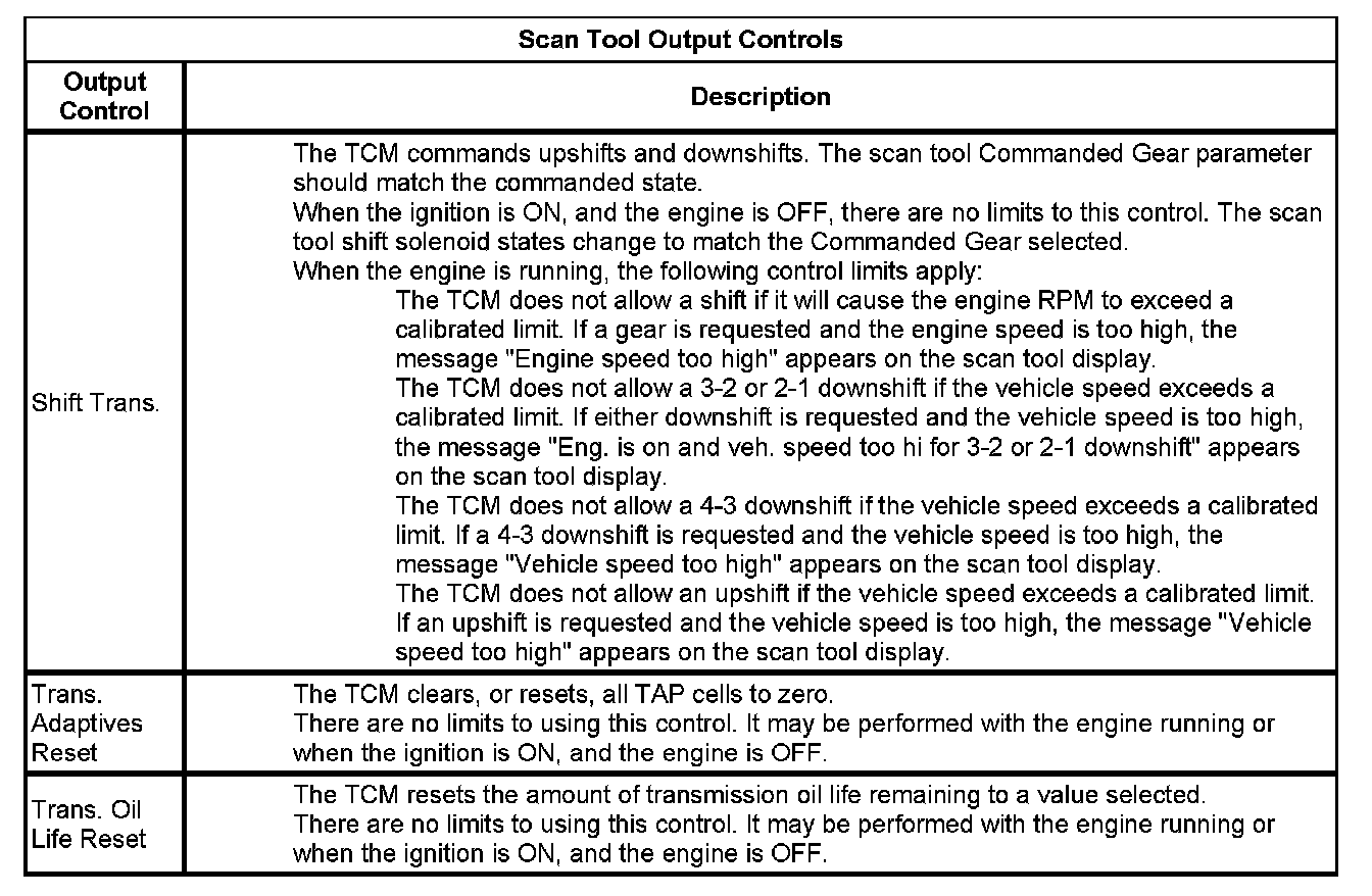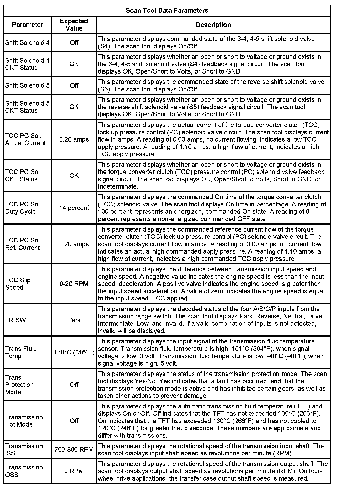 The Transmission Control Module Scan Tool Data List contains all transmission related parameters that are available on the scan tool. The list is arranged in alphabetical order. A given parameter may appear in any one of the data lists, and in some cases may appear more than once, or in more than one data list in order to group certain related parameters together.