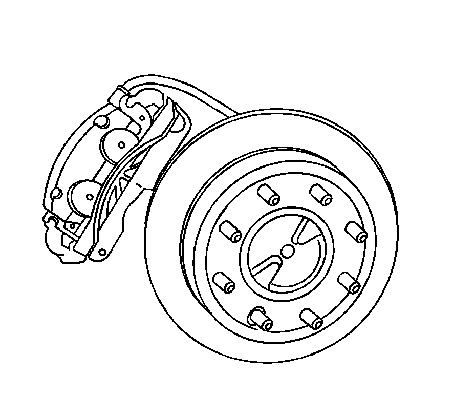 Notice: Support the brake caliper with heavy mechanic wire, or equivalent, whenever it is separated from its mount and the hydraulic flexible brake hose is still connected. Failure to support the caliper in this manner will cause the flexible brake hose to bear the weight of the caliper, which may cause damage to the brake hose and in turn may cause a brake fluid leak.