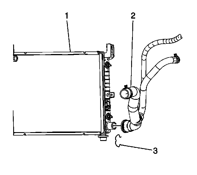 3. Remove the radiator outlet hose (2) from the quick connector fitting at the radiator (1).