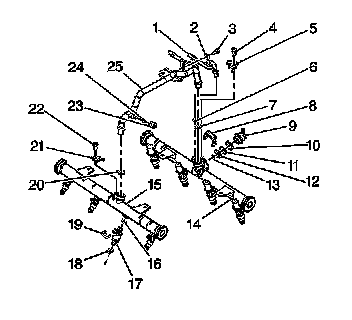 5. Install the fuel injector (17) into the fuel rail injector socket with the electrical connector facing outward. The retainer clip (19) locks onto a flange on the fuel rail injector socket.
