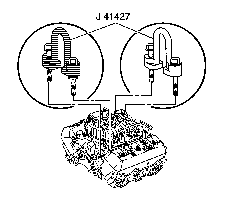 39. Install J 41427 to the left front and right rear intake manifold bolts, using the following procedure: