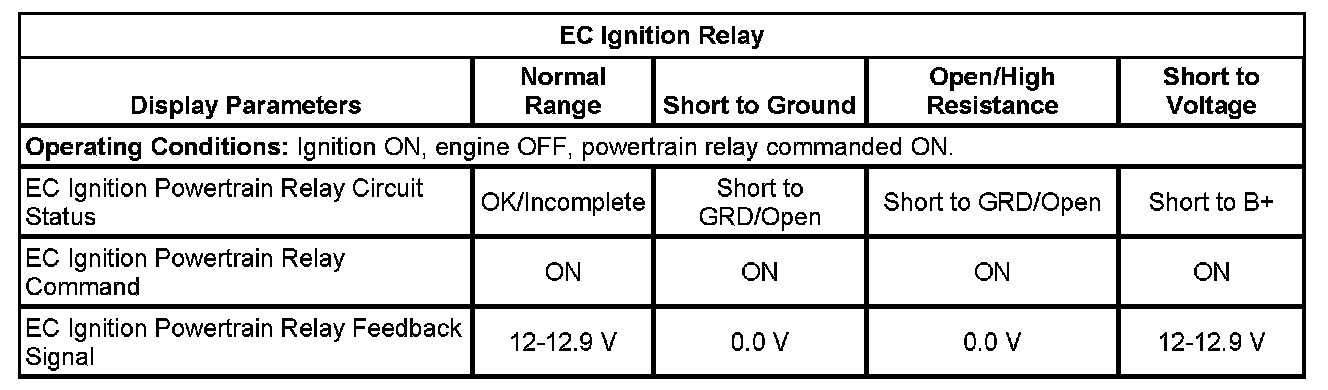 12. Ignition ON, engine OFF, monitor the EC Ignition Relay Feedback parameter with a scan tool. The parameter should display B+.