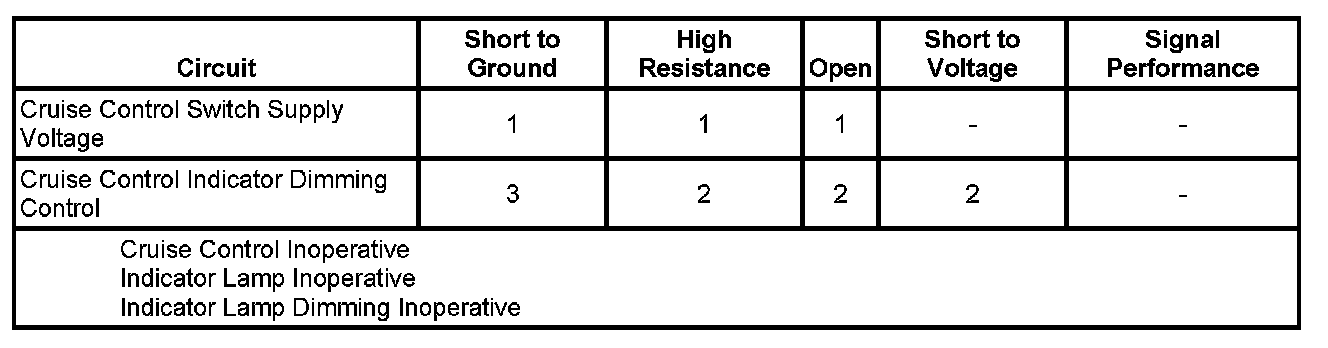 This diagnostic assumes the cruise control system is operating properly and no DTCs are set. If the cruise control system is malfunctioning, refer to Cruise Control Malfunction. Cruise Control Malfunction
