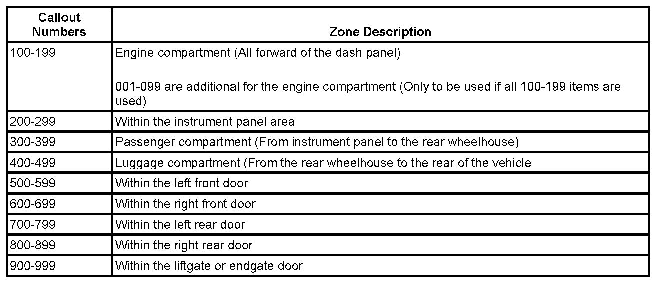 All grounds, in-line connectors, pass-through grommets, and splices have identifying numbers that correspond to where they are located in the vehicle. The table explains the numbering system.