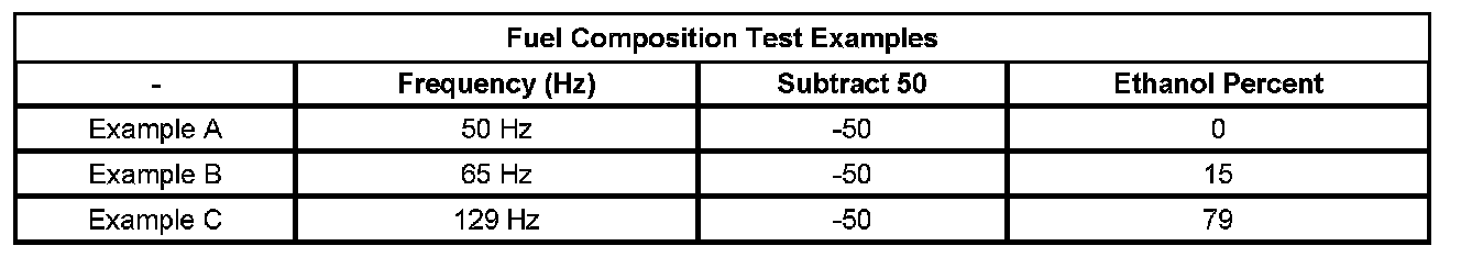 2. Subtract 50 from the reading on the DMM in order to obtain the percentage of alcohol in the fuel sample. Refer to the examples in the Fuel Composition Test Examples table.