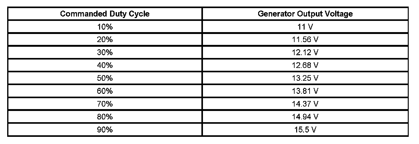 The engine control module (ECM) controls the generator through the generator turn on signal. It monitors the generator performance though the generator field duty cycle signal circuit. The signal is a 5-volt pulse width modulation (PWM) signal of 128 Hz with a duty cycle of 0-100 percent. Normal duty cycle is between 5-95 percent. Between 0-5 percent and 95-100 percent are for diagnostic purposes. The following table shows the commanded duty cycle and output voltage of the generator: