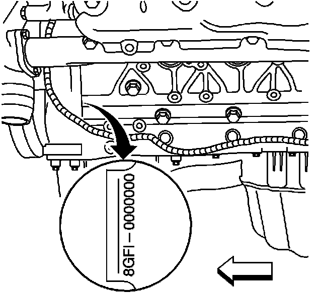 The engine identification tag is located on the left side of the block. It is on the front edge of the block.