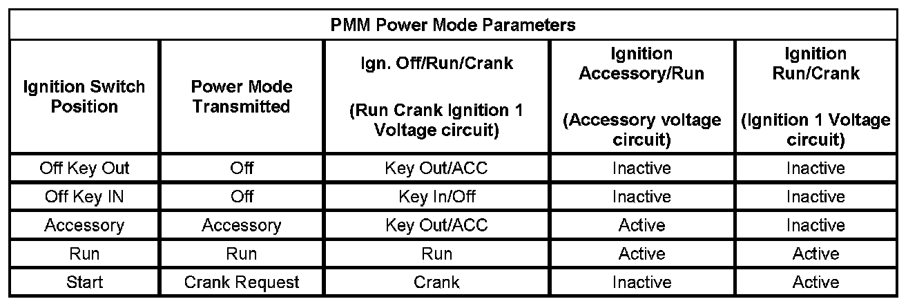 The PMM receives ignition switch signals to identify the operators desired power mode. The PMM Power Mode Parameters table below illustrates the correct state of these input parameters (circuits) in correspondence to the ignition switch position: