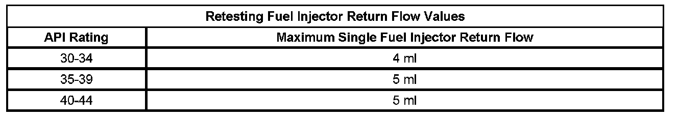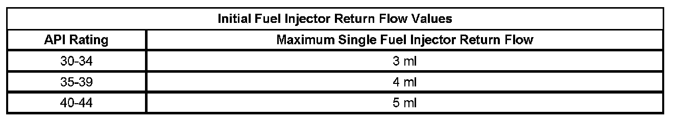 The fuel return from the fuel injectors to the tank will vary based on the API value of the fuel. Measure the Fuel API with the Diesel Fuel Quality Tester. For this reason the Fuel System Diagnosis - High Pressure Side values will vary for identifying a fuel injector or fuel pump concern. Use the following tables when referred to by the diagnostic. The first table is to be used during the initial diagnosis to identify the worst fuel injectors. After the fuel injectors that fail the first part of the test are capped off, the return flow from each uncapped fuel injector must be measured again. This is because the fuel system is returning less fuel to the tank, and thus the fuel pressure is higher during the retest. Failure to use the correct table may result in the replacement of good fuel injectors.