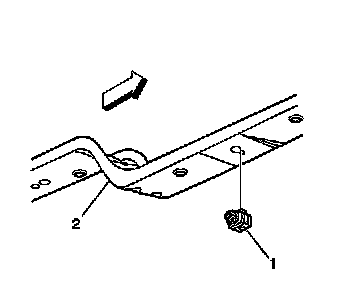3. Install the inflatable restraint front end sensor (1) into the keyhole slot in lower radiator support (2).