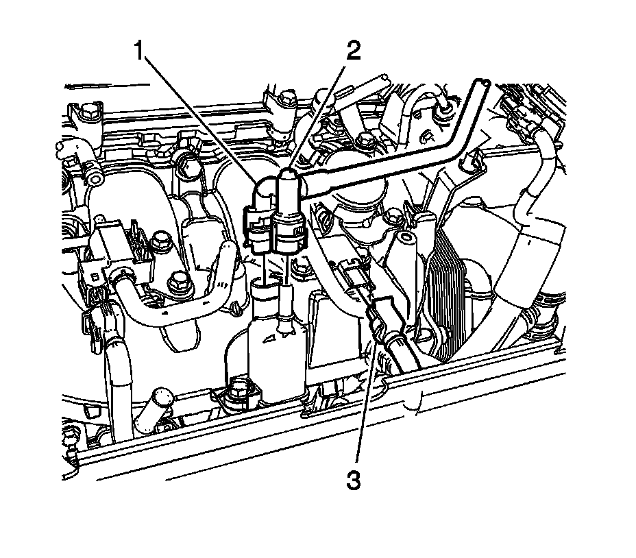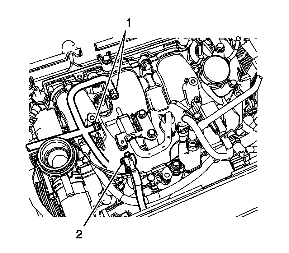 8. Disconnect the evaporative emission (EVAP) line quick connect fitting (2) from the EVAP purge solenoid. Refer to Plastic Collar Quick Connect Fitting Service (Plastic Collar Quick Connect Fitting Service) .