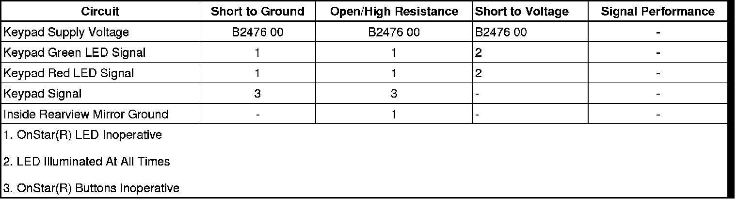 The OnStar(R) status LEDs are located with the OnStar buttons.. The green LED is illuminated when the system is ON and operating normally. When the green LED is green and flashing, it is an indication that a call is in progress. When the red LED is illuminated, a system malfunction is present. In the event there is a system malfunction and the OnStar(R) system is still able to make a call, the LED will flash red during the call. The OnStar(R) LEDs are controlled by the communication interface module (CIM) via the keypad green LED signal circuit and the keypad red LED signal circuit.