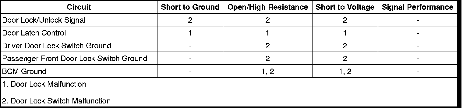 The dr lck fuse supplies battery positive voltage to the body control module (BCM) for the door lock system. The BCM supplies and monitors a reference voltage to the door lock switch through the door lock switch lock/unlock signal circuit. The door lock switch also receives a constant ground source. If a door lock switch is placed in the lock position, the reference voltage is taken directly to ground and the BCM senses 0.0 volt on the signal circuit. If a door lock switch is placed in the unlock position, the reference voltage is taken to ground through a 1.5k ohm resistor that is internal to the door lock switches and senses approximately 2.9 volts on the signal circuit. This is how the BCM determines what portion of the door lock switch was activated. The BCM, upon receipt of a door lock switch lock or unlock signal, will switch the appropriate door lock actuator control circuits to battery positive voltage. The opposing side of the door lock actuators are connected to ground internally within the BCM through the other door lock actuator control circuit and the doors will lock or unlock appropriately. Vehicles without keyless entry have 2 internal drivers in the BCM to control the door lock actuators. All door lock and all door unlock. Vehicles equipped with keyless entry have 3 internal drivers in the BCM. Driver door unlock, passenger door unlock and all door lock. This is done to isolate the driver door lock actuator so it can be unlocked by itself using the keyless entry transmitter.