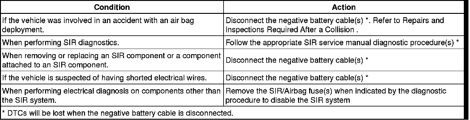 Caution: When performing service on or near the SIR components or the SIR wiring, the SIR system must be disabled. Failure to observe the correct procedure could cause deployment of the SIR components. Serious injury can occur. Failure to observe the correct procedure could also result in unnecessary SIR system repairs.