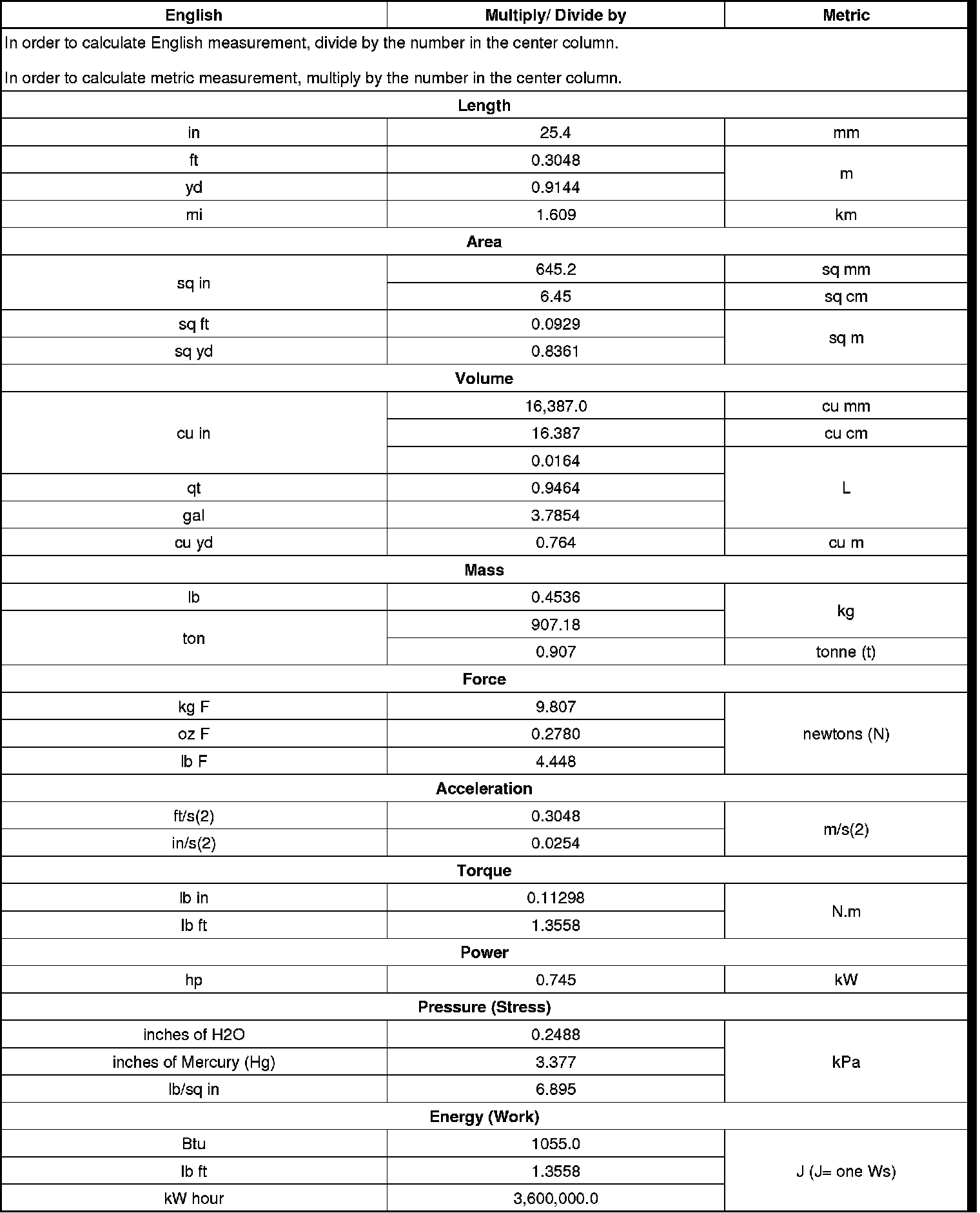 US English/Metric Conversion