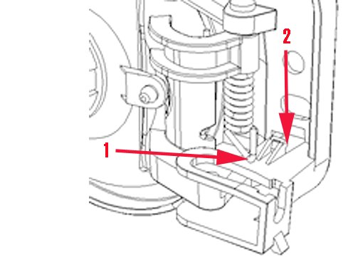 8. Restore tension to the spring by hooking the exposed end of the spring (1) under the spring land on the black housing (2).
