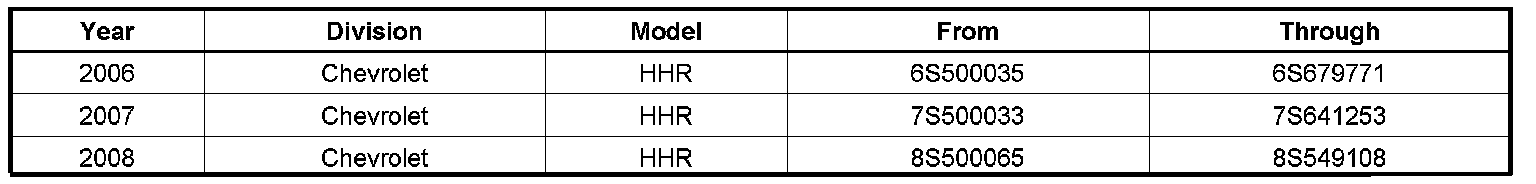 Involved are all 2006-2007 model year and certain 2008 model year Chevrolet HHR vehicles without roof-rail airbags and built within the VIN breakpoints shown.