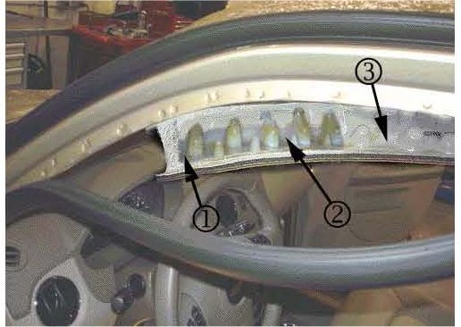 4. Locate the installation point for installing the energy absorbing (EA) plastic piece (2) onto the A-pillar edge (1) of the headliner (3).