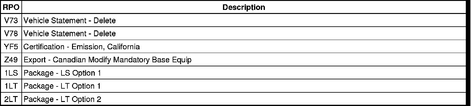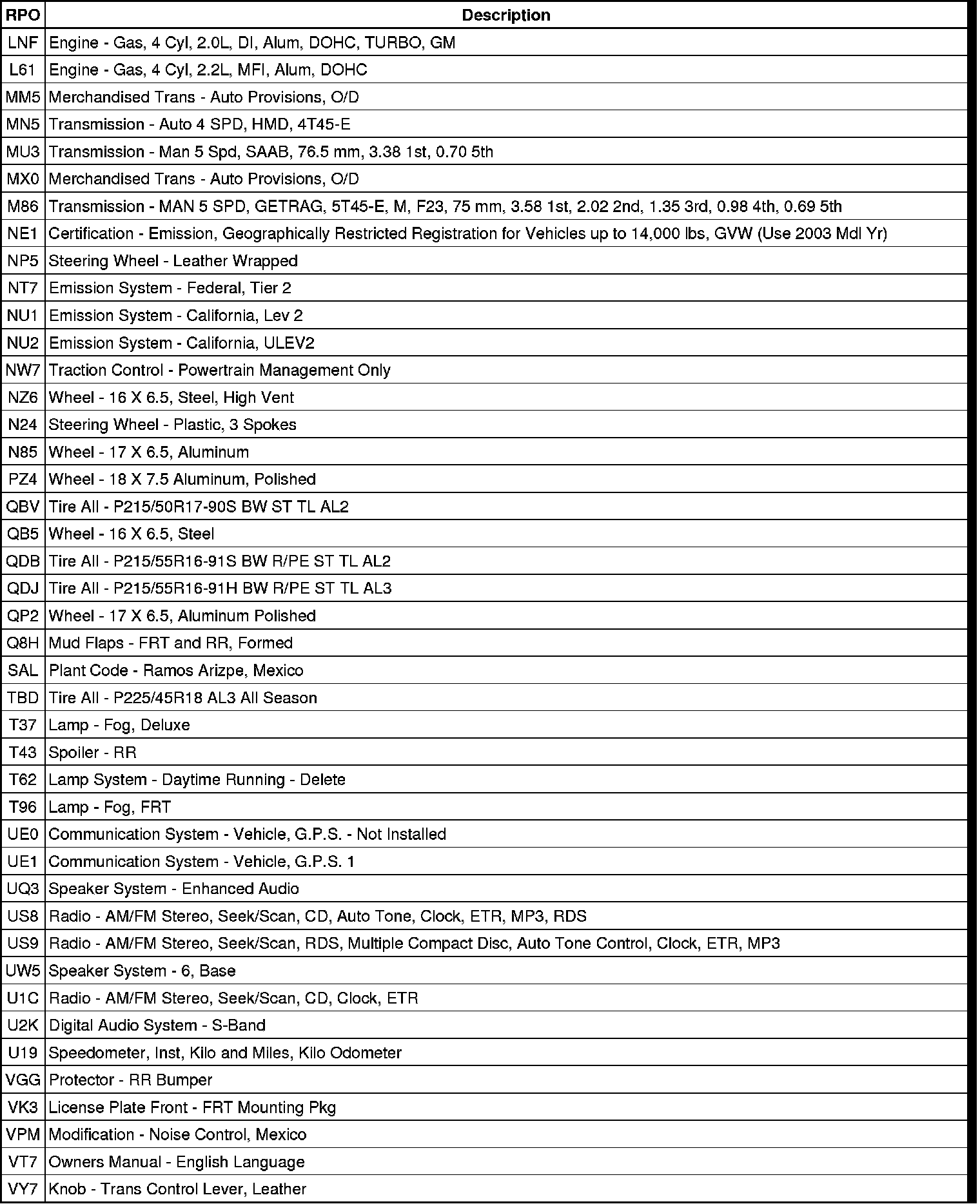 RPO Code List
