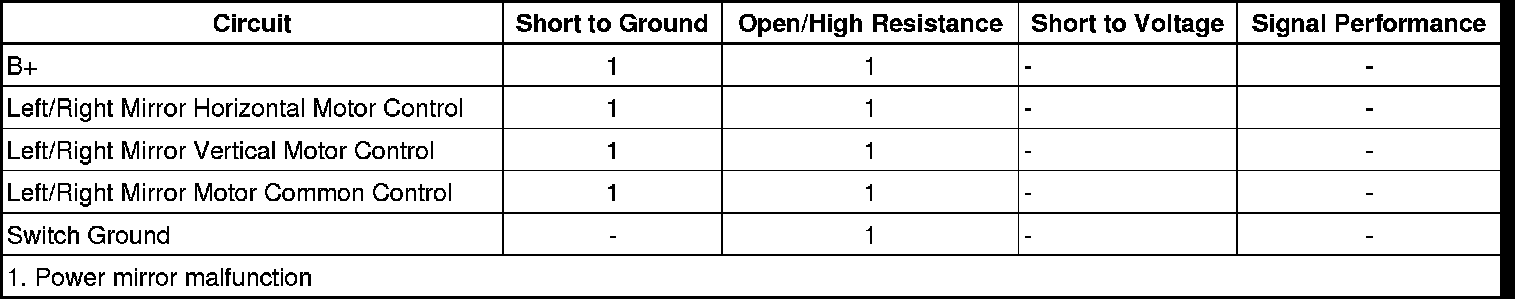 6. Mirror select switch in the appropriate mirror position, test for infinite resistance between the listed control circuit terminals and ground.
