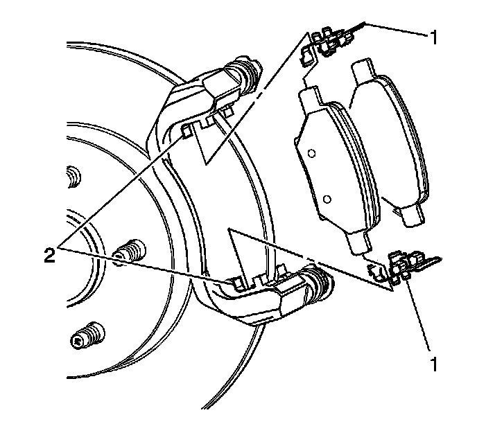 14. Thoroughly clean the brake pad hardware mating surfaces of the caliper bracket (2) of any debris and corrosion.