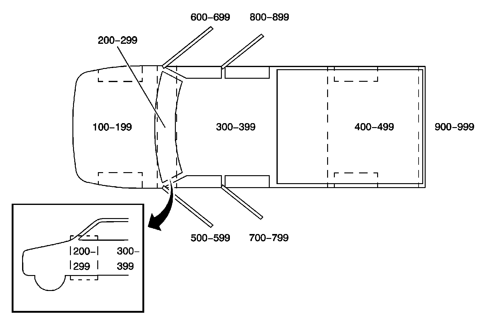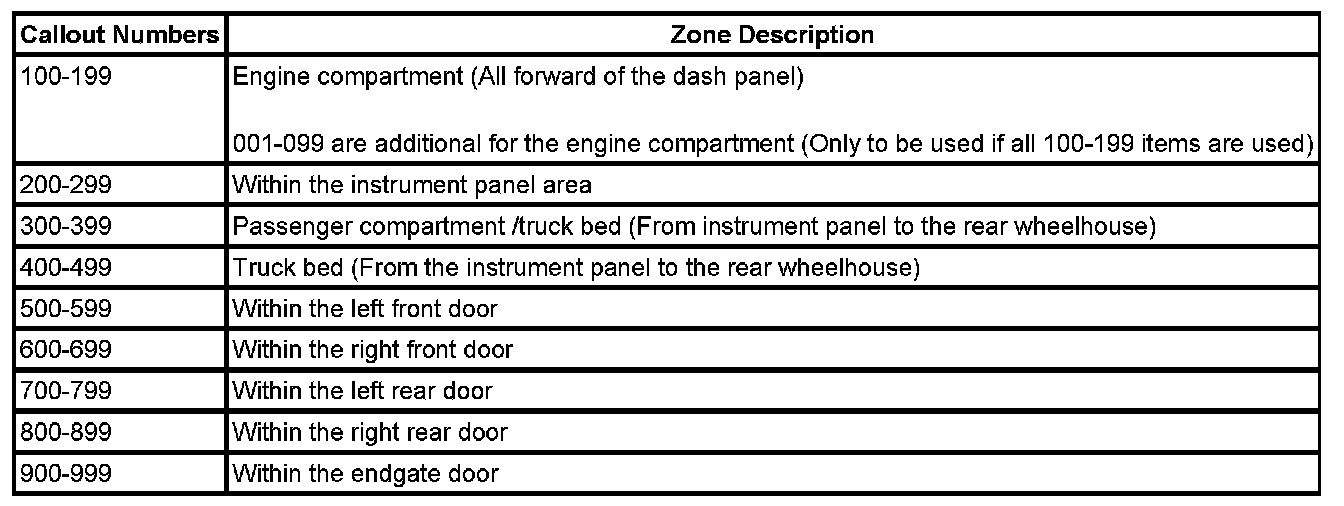 All grounds, in-line connectors, pass-through grommets, and splices have identifying numbers that corresponds to where they are located in the vehicle. The following table explains the numbering system.