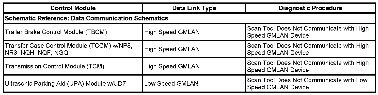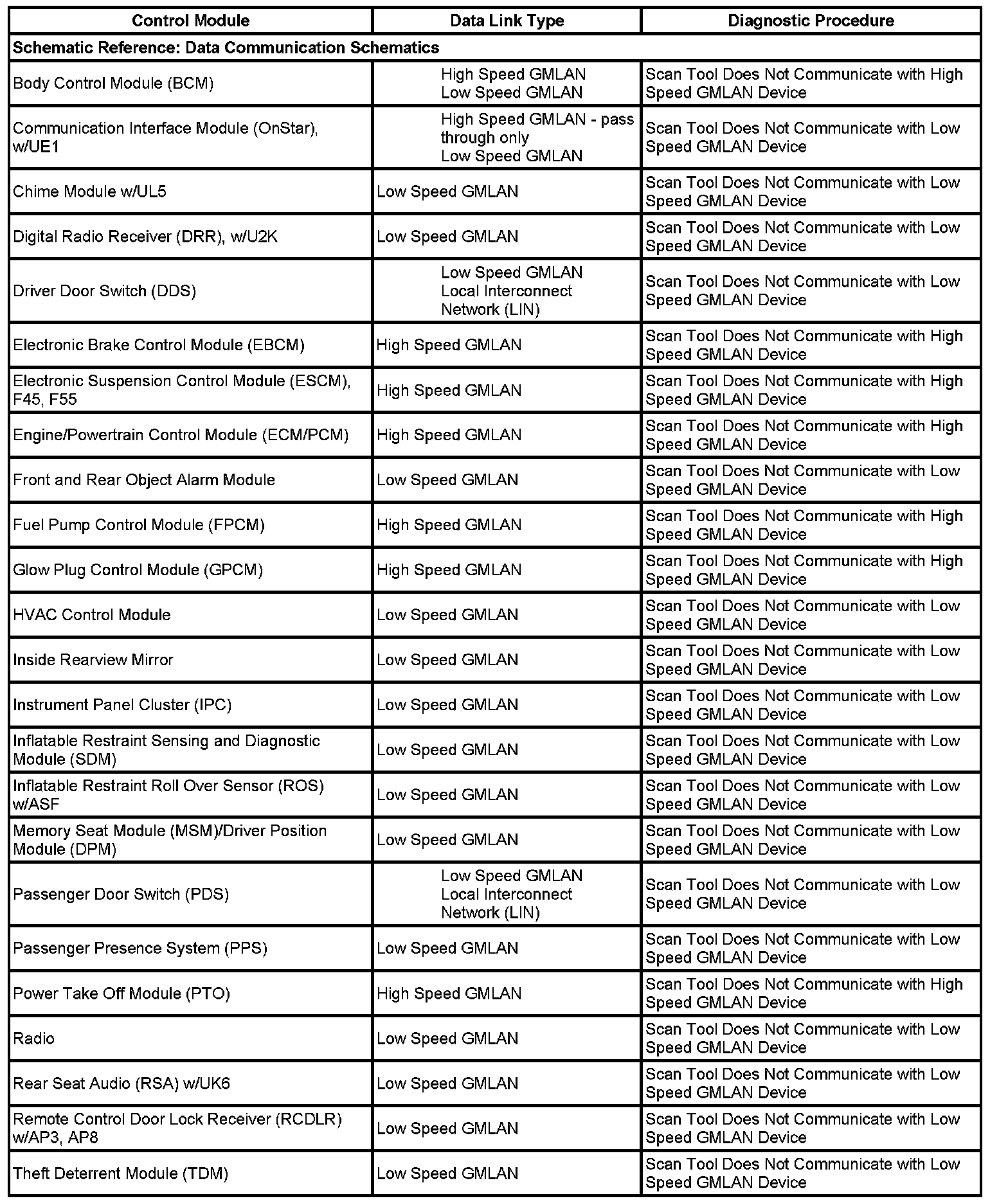 This table identifies which serial data link that a particular module uses for in-vehicle data transmission. Some modules may use more than one data link to communicate. Some modules may have multiple communication circuits passing through them without actively communicating on that data link. This table is used to assist in correcting a communication malfunction. For the description and operation of these serial data communication circuits refer to Data Link Communications Description and Operation.