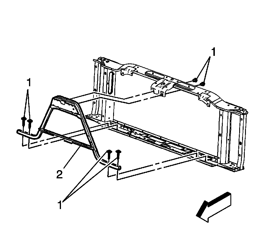 8. Install the radiator support. Access the bolts (1) from the rear of the upper radiator support.