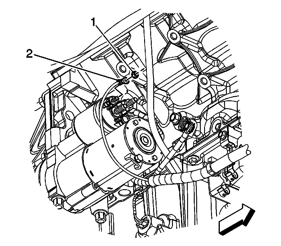 13. Remove the starter solenoid cable clip bolt (2) from the frame.