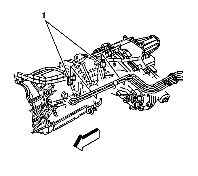 6. Remove the EVAP/fuel hose/pipe assembly from the retaining clips (1) on the transmission.