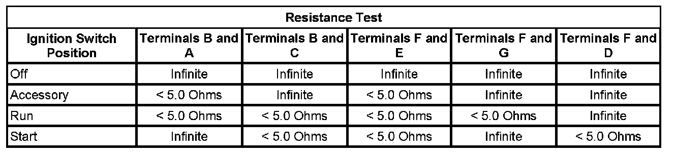 2. Using the Resistance Test table below, check the resistance between the terminals of the ignition switch listed in each switch position.