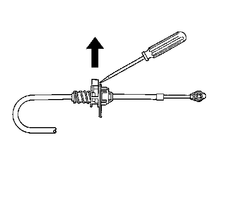 3. Use an appropriate tool to pry on the automatic transaxle range selector cable terminal at the automatic transaxle range selector lever pin to remove the automatic transaxle range selector cable terminal from the transaxle manual shaft lever pin. DO NOT pry and DO NOT pull up on any other part of the automatic transaxle range selector cable or damage may occur.