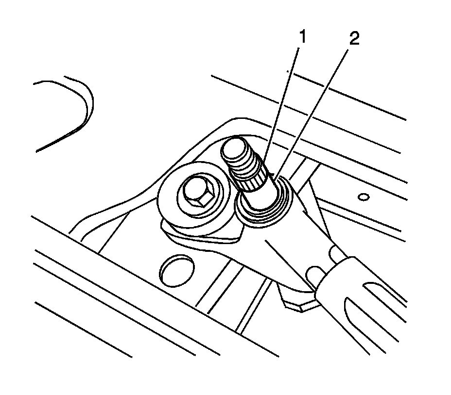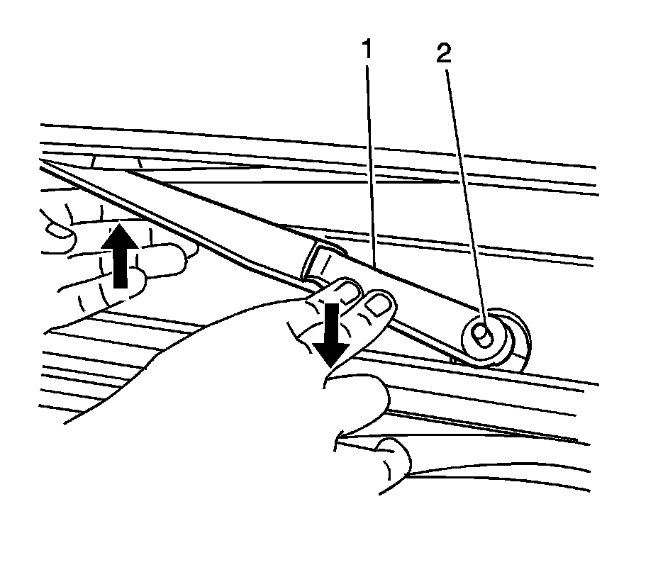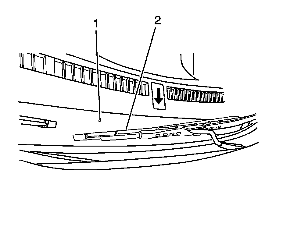 2. Lift the wiper blade off the windshield and install the wiper arm (1) to the wiper arm pivot shaft (2).
